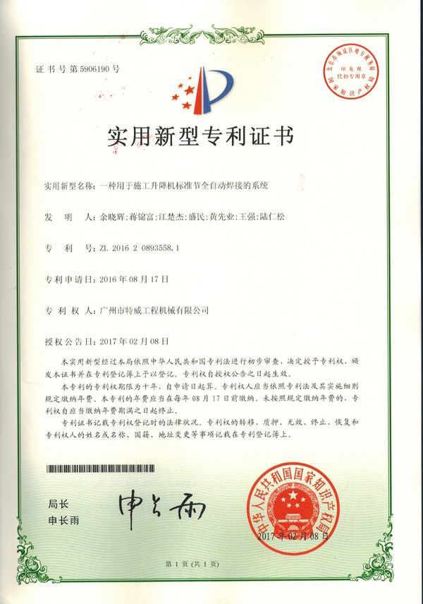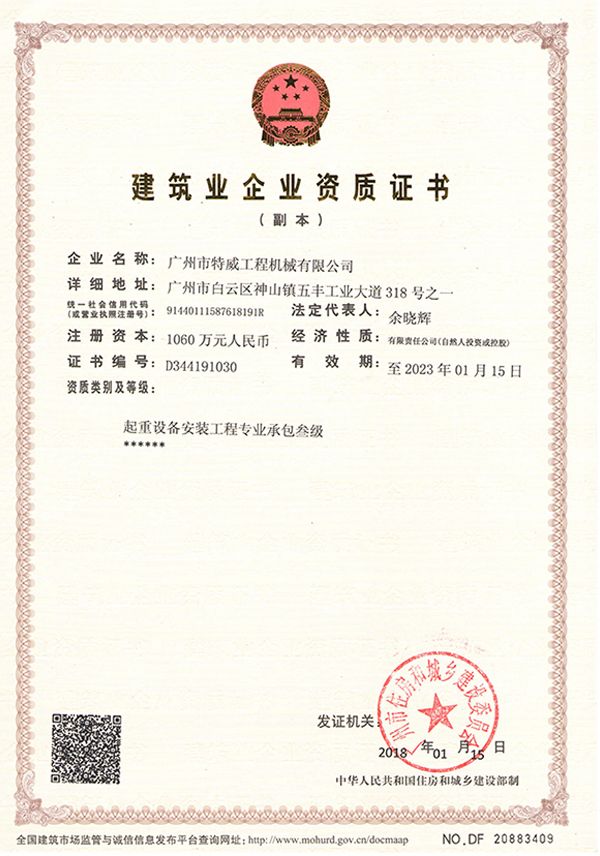 廣州市特威工程機(jī)械有限公司地處廣州市白云區(qū)神山鎮(zhèn),廣清高速神山出口附近,是一家施工升降機(jī)的專業(yè)生產(chǎn)廠家。公司成立于2011年,占地100000多平方米,注冊(cè)資金1060萬(wàn)元,現(xiàn)有員工300余人其中工程技術(shù)人員33人,高級(jí)技術(shù)人員52人。